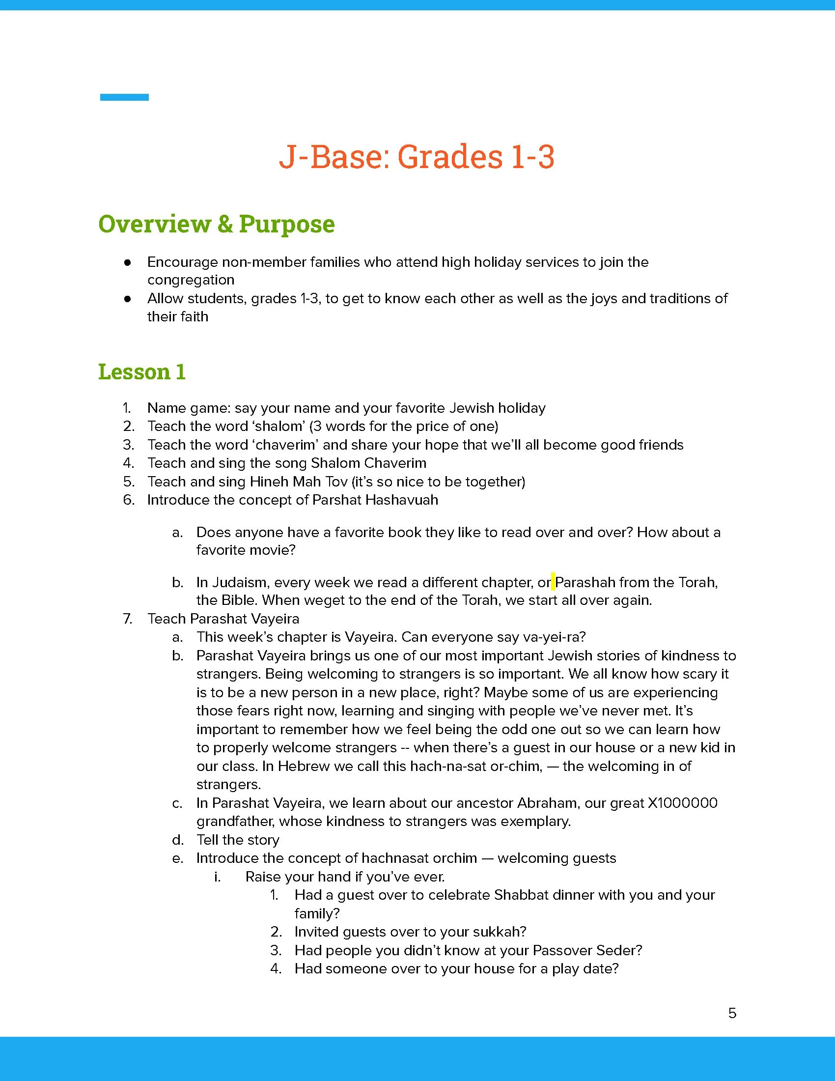 Last year I taught a course on Jewish Basics for children in Grades 1 through 3 over Zoom. The purpose of this course was to encourage non-member families who attended High Holiday services to join the congregation. I am proud to say that two students did so. My goal was to allow online learners to get to know each other, as well as the joys and traditions of Judaism. Students were actively engaged for the duration of each class, and soon deep friendships started to form between participants who had never met in person.